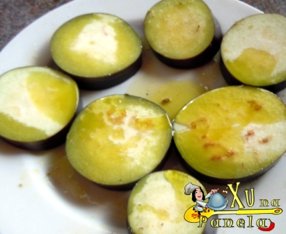 Corte a berinjela em rodelas de cerca de 1,5cm. Passe cada fatia no azeite e tempere com sal.