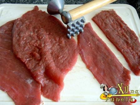 Bata os bifes com um martelo de carne para que fiquem bem finos. corte no tamanho desejado e tempere com sal e pimenta do reino à gosto.