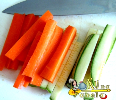 Corte a aboborinha e cenoura em palitos grossos. O comprimento deve ser o mesmo da largura do bife. Tempere com sal e pimenta do reino. Reserve.