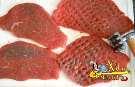 Tempere os bifes com sal e pimenta do reino. Bata cada bife com o martelo de carne.