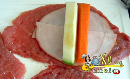 Coloque uma fatia de peito de peru, um palito de cenoura e um de abobrinha sobre cada bife.