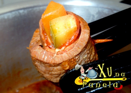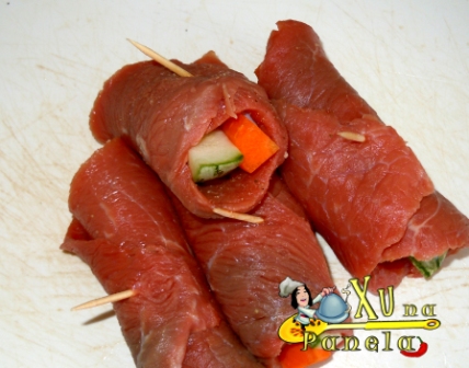 Enrole os bifes e prenda com um palito de madeira.