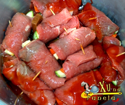 Coloque os rolinhos de bife sobre as cebolas.