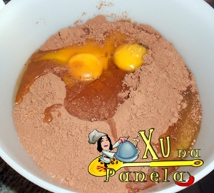 Em uma vasilha, junte a farinha, o açúcar e o chocolate em pó.