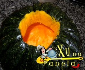 Encha com água salgada pela metade e leve ao forno microondas em potência máxima por 15 minutos. Caso você esteja usando outro tipo de abóbora (como eu fiz uma vez com mini-abóboras para porções individuais) comece com cinco minutos no microondas e vá testando com o garfo.