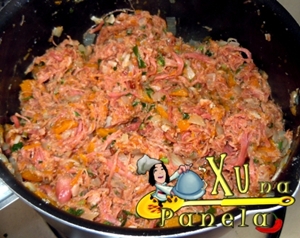 Adicione a carne seca desfiada e a pimenta calabresa. Junte também a abóbora que sobrou na tampa que foi retirada (pra que desperdício, certo?) cortada em cubos médios.