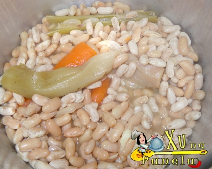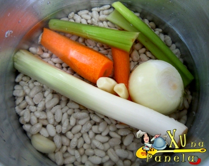 Descarte a água. Coloque o feijão, um talo de alho poró, um talo de salsão, uma cebola e três dentes de alho na panela de pressão. Cubra tudo com 1,5 litros de água.