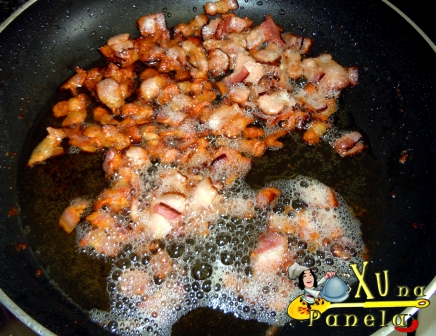 Corte o bacon em cubos. Frite até que fique bem crocante a solte bastante gordura. Retire o bacon e reserve.