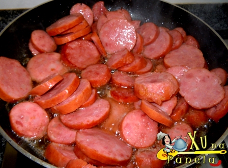 Retire a capa das linguiças. Na gordura do bacon, frite as linguiças cortadas em rodelas. Retire as linguiças e reserve.