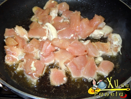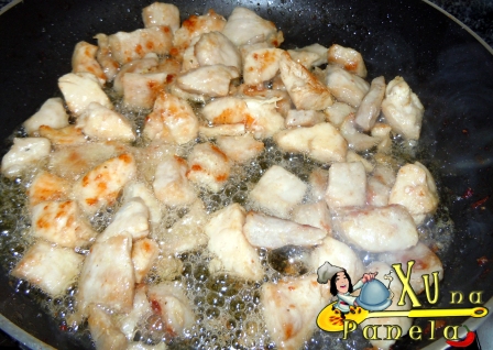 Corte o frango e o lombo em cubos, tempere com sal e pimenta do reino. Frite as carnes na mesma gordura. Retire e reserve.