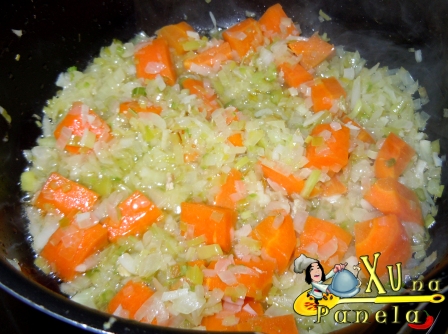 Corte uma cenoura em cubos, pique a cebola, os dentes alho, a cebola, o alho poró e o salsão restantes. Refogue tudo na gordura da panela.