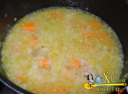 Cozinhe por vinte minutos. Retire o salsão e o alho poró. Reserve.