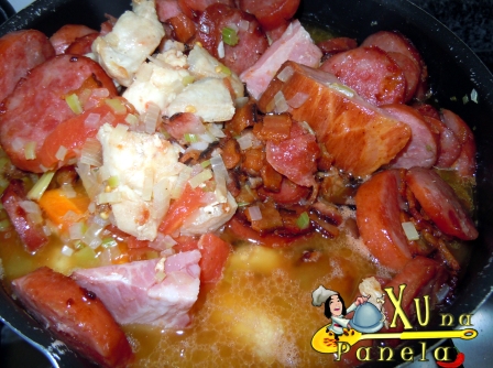 Na França, é bem comum colocar vários tipos de carnes, como pato, ganso e cordeiro. Eu preferi me ater ao porco e frango, assim o prato fica mais acessível e abrasileirado.