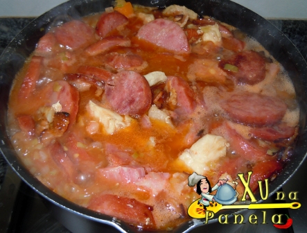 Adicione todas as carnes à panela, inclusive a costela defumada.