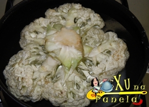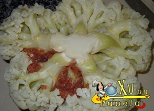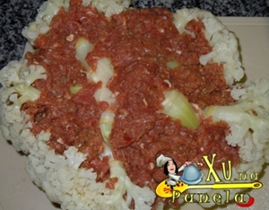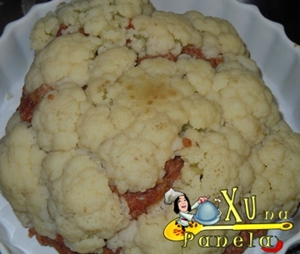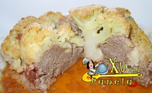 Tempere a carne moída (cuidado com o sal, pois o caldo de galinha ainda será usado) com todos os outros ingredientes, exceto o caldo de galinha. Insira pequenas porções nos vãos da couve-flor, tomando sempre cuidado para não desmanchar a couve-flor.
