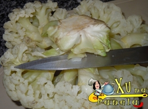 Escorra a água e corte o talo em demasia sem deixar que a couve-flor se divida.