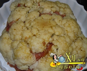 Dissolva o caldo de galinha em meio copo de água quente e regue a couve-flor. Se quiser, pode polvilhar um pouco de farinha de rosca.