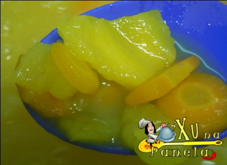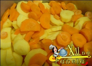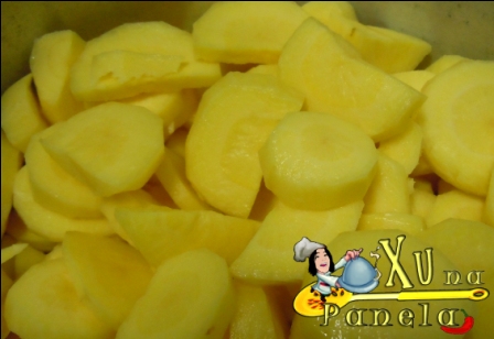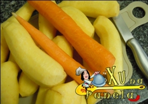 Repita o procedimento com as cenoura e coloque junto com a mandioquinha em uma panela de pressão grande.