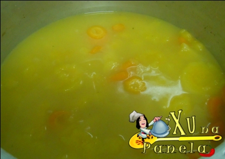 Junte o restante dos ingredientes, corrija o sal se julgar necessário e cozinhe em fogo “médio” (deixe o botão do gás entre o alto e o baixo) por 15 minutos, mexendo de vez em quando.