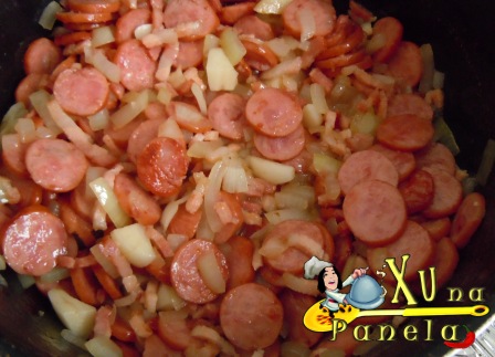 Junte a calabresa, o bacon e a manteiga em uma panela e frite por cerca de 15 minutos.