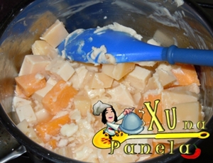 Os queijos podem ser variados, desde que seja “fundível“, ou seja, ele tem que derreter e não ficar “puxa-puxa“, como acontece com a muçarela, por exemplo. Eu usei cinco tipos, mas não é preciso de tantos.