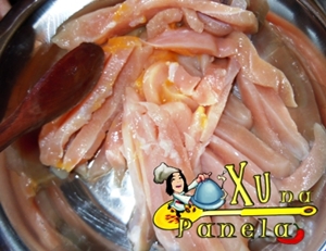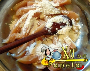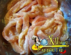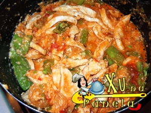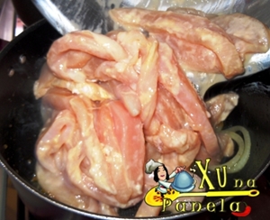 Junte o frango sem mexer muito. Adicione o caldo de galinha, a pimenta do reino e o vinho branco.