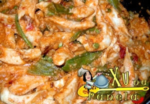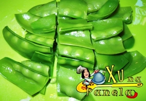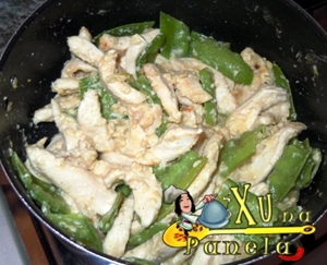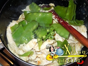 Deixe dourar levemente e então coloque a ervilha torta. Cozinhe por mais cinco minutos, aproximadamente.