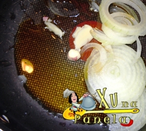 Frite no azeite a cebola cortada em rodelas e os dentes de alho amassados até dourar.