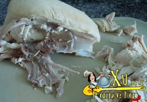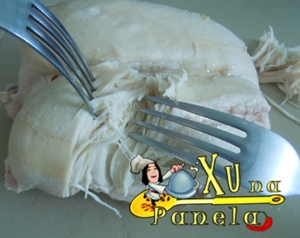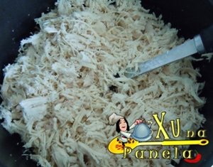 Desfie o frango com auxílio de dois garfos, ou, se preferir, com as mãos. Particularmente, gosto de separar grandes porções com o garfo e terminar de desfiar com as mãos pra sentir bem o frango e não deixar passar nada desapercebido. Nada mais desagradável que encontrar uma cartilagem ou um ossinho no meio da sua torta, principalmente para quem tem asco de cartilagem (meu caso).