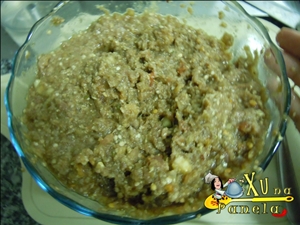 Junte essa polpa à carne moída. Tempere com sal, vinagre balsâmico, pimenta calabresa seca e duas colheres (sobremesa) de farinha de rosca. Pode usar a criatividade e acrescentar outros temperos que quiser, como queijo, alho, ervas e afins.