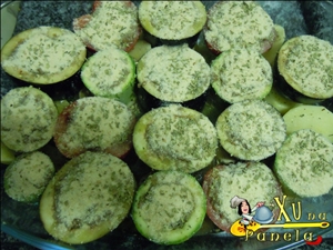 Repare que embaixo de cada abobrinha e de cada berinjela tem uma rodela de batata. Os pedaços de batata que sobraram coloquei ao lado para assar junto. Na minha cozinha, quase nada vai para o lixo.