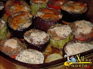 – o2 berinjelas – 01 abobrinha do tipo italiana – 02 tomates – 02 batatas médias descascadas – 300g de carne bovina moída (patinho de preferência) – 1 colher (sobremesa) de vinagre balsâmico (substitua por shoyu se não tiver) – 1/2 copo de vinho branco seco de mesa – azeite – farinha de rosca (cerca de 3 ou 4 colheres) – sal – pimenta calabresa seca – orégano