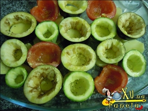 Tempere as batatas, os legumes e os tomates com sal (bem pouco, pois o recheio será temperado também), monte na travessa e regue com um pouco de azeite.