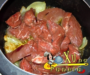 Junte a carne à cebola e deixe fritar por 5 a 10 minutos, virando na metade do tempo.