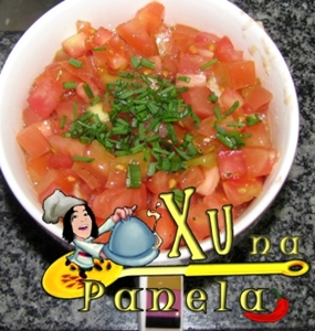 Finalize com o tomate picadinho e com a cebolinha por cima de tudo. Sirva.