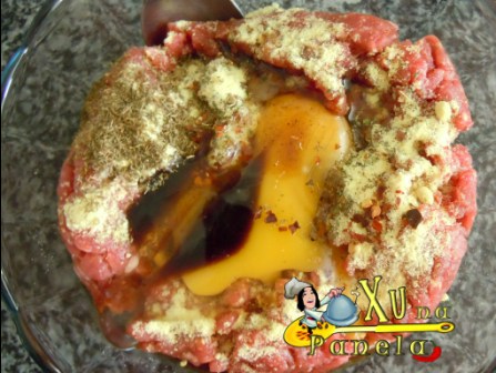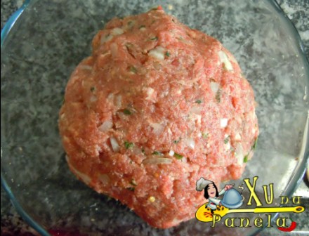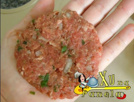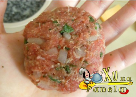 Pegue um tanto de carne condizente com o tamanho que vc deseja que seja seu polpetone e abra um “hamburger” de 1cm de altura na palma da mão.