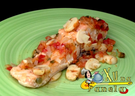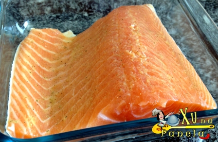 Tempere o filé se salmão com sal e pimenta do reino. Disponha em um refratário.