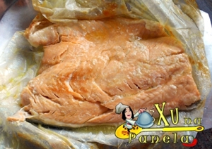 Retire o peixe do forno, abra, tire o papel manteiga.