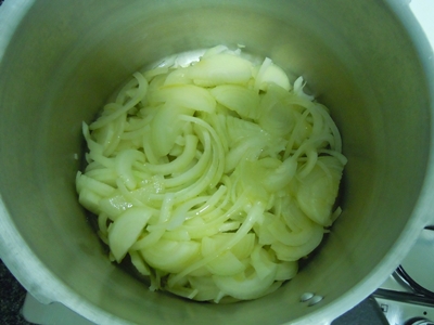 Corte a cebola ao meio e em seguida fatie cada metade para fazer meias-rodelas de cebola. Frite levemente a cebola no azeite.