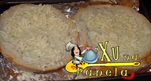 Preencha o pão com o creme de palmito, polvilhe com queijo.