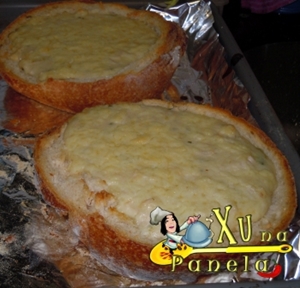 Retire parte do miolo com as mãos e pressione bem as paredes de dentro contra a casca, formando dois “pratos” de sopa.