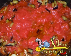 – 1/2 berinjela cortada em cubos – 4 colheres (sopa) de azeite – 1 dente de alho – sal e pimenta do reino a gosto – pimenta calabresa seca a gosto – 1 xícara de manjericão fresco (10-12 folhas) – noz moscada a gosto – 1 lata de tomate pelado – 1 colher (chá) de açúcar-sal a gosto – 100g de queijo Gouda ralado grosso – 500g de Spaghetti