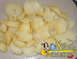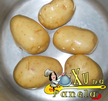 Cozinhe as batatas até ficarem bastente macias. Com elas já descascadas, pique tudo em cubos médios e reserve.