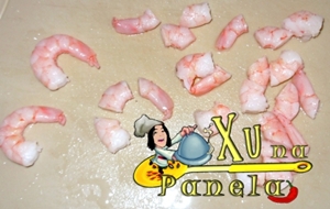 No caso, o camarão pequeno é melhor, como eu não tinha, cortei os que eu tinha aqui na geladeira.
