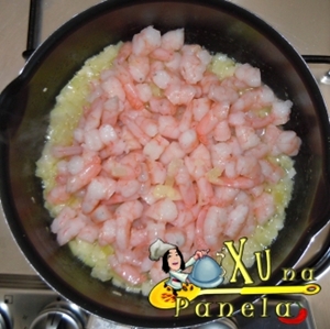 Em seguida, acrescente o recheio de camarão uniformemente.