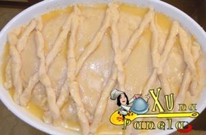 Reserve cerca de um terço da massa preparada para fazer a tampa. Unte um refratário com óleo e farinha e forre com a massa.