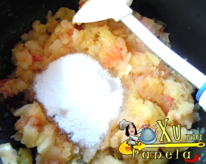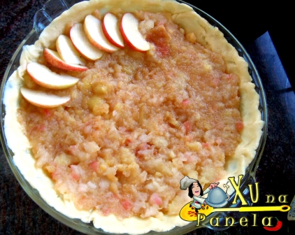 Junte o restante dos ingredientes do recheio, com exceção das duas maçãs, amasse tudo e misture bem até obter um purê. Reserve.