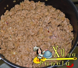 Coloque todos os ingredientes do recheio, exceto o queijo, em uma panela e cozinhe mexendo de vez em quando para a carne não ficar empelotada.