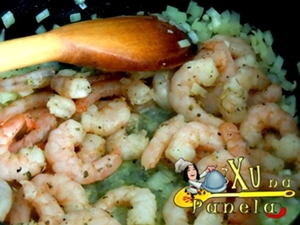 Junte o camarão temperado com sal e ervas finas e cozinhe por 5 minutos. (Atualização: deixe para acrescentar o camarão numa etapa mais avançada, senão ficará duro)