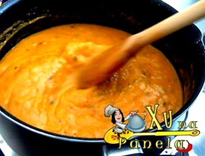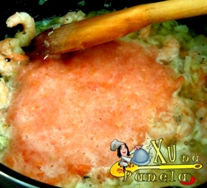 Junte a manteiga, o tomate e a polpa de tomate, tempere com sal e pimenta do reino e cozinhe por, pelo menos, 15 minutos (aqui é bom colocar uma pitada de açúcar pra cortar a acidez do tomate).